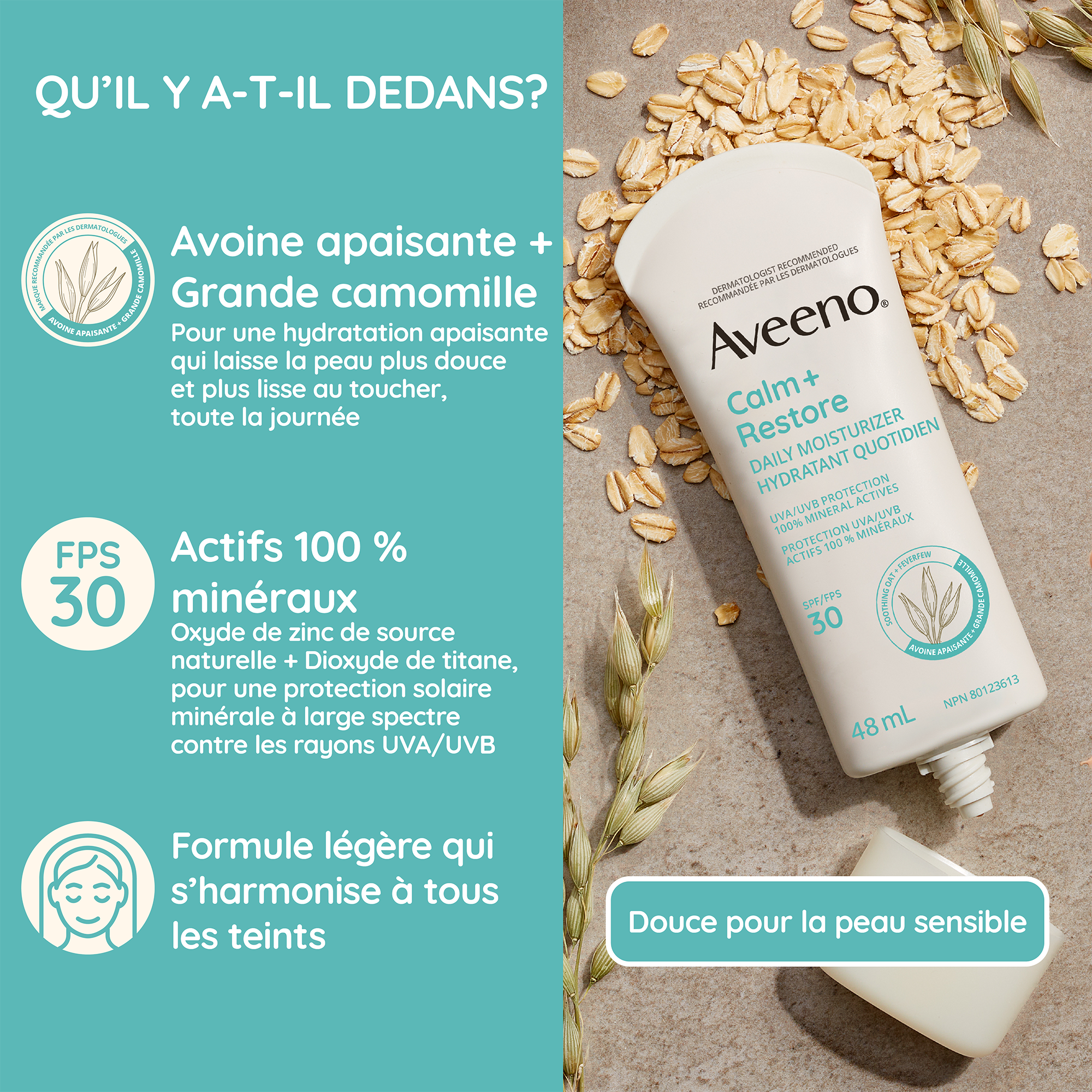 Formule cliniquement éprouvée à base d’avoine colloïdale pure et de grande camomille, procurant une hydratation apaisante qui dure toute la journée, et d’actifs 100 % minéraux (dioxyde de titane et oxyde de zinc) de source naturelle, doux pour la peau sensible.